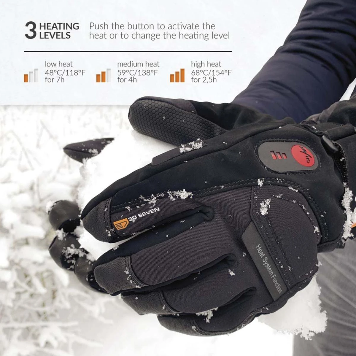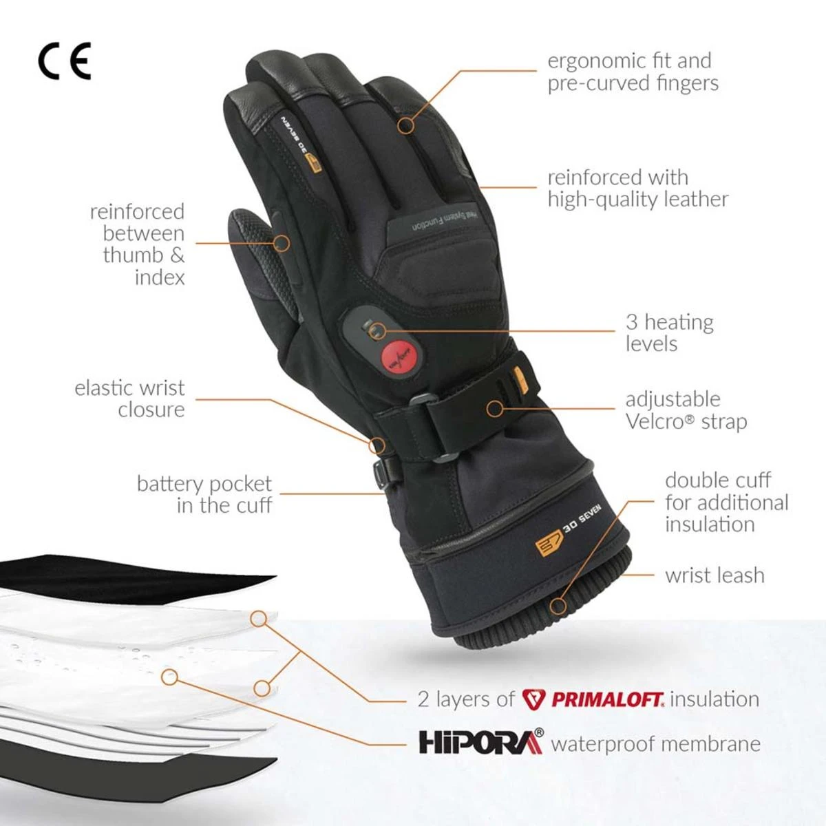 These extra warm heated 30seven gloves offer the perfect solution for people who suffer from cold hands. The integrated Novaheat technology will instantly give you warm hands and fingers! The gloves are also waterproof, wind resistant and have an adjustable Velcro strap plus elastic wrist enclosure to retain the warmth. A 3-layer Hipora membrane prevents water from coming in while letting moisture out. Additional reinforcement with high-quality leather in important areas, on top and bottom of the glove, gives you extra protection and prevents grazes and cuts. Furthermore it is possible to use your smartphone with these gloves thanks to the integrated index touchscreen finger.