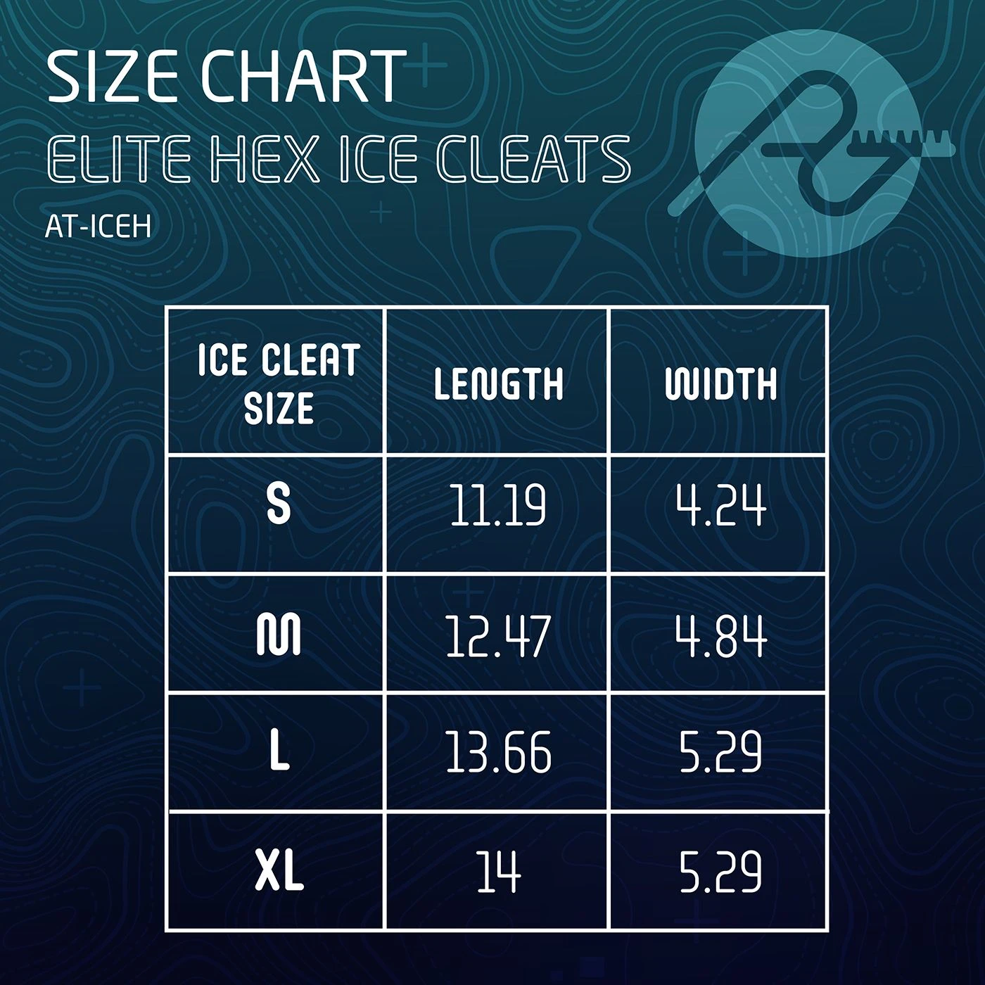 Action Traction Elite Hex Ice Cleats are sturdy ice-gripping soles that provide instant traction on all ice, snow, or mud. They are true heavy-duty snow & ice cleats that provide maximum traction on slippery surfaces. Winter can be tough, but Action Traction Elite Hex Ice Cleats are tougher. Serious traction gear for anyone dealing with serious weather conditions. Long-lasting soles with steel cleats bite into the slickest ice and snow. Simply attach Action Traction Elite Hex Ice Cleats to your favorite shoes or boots with hook-and-loop fasteners and never let icy conditions keep you indoors again. Great for winter hiking, hunting, ice fishing, and working outdoors. Provides instant traction on ice, snow, and mud for increased safety and stability.