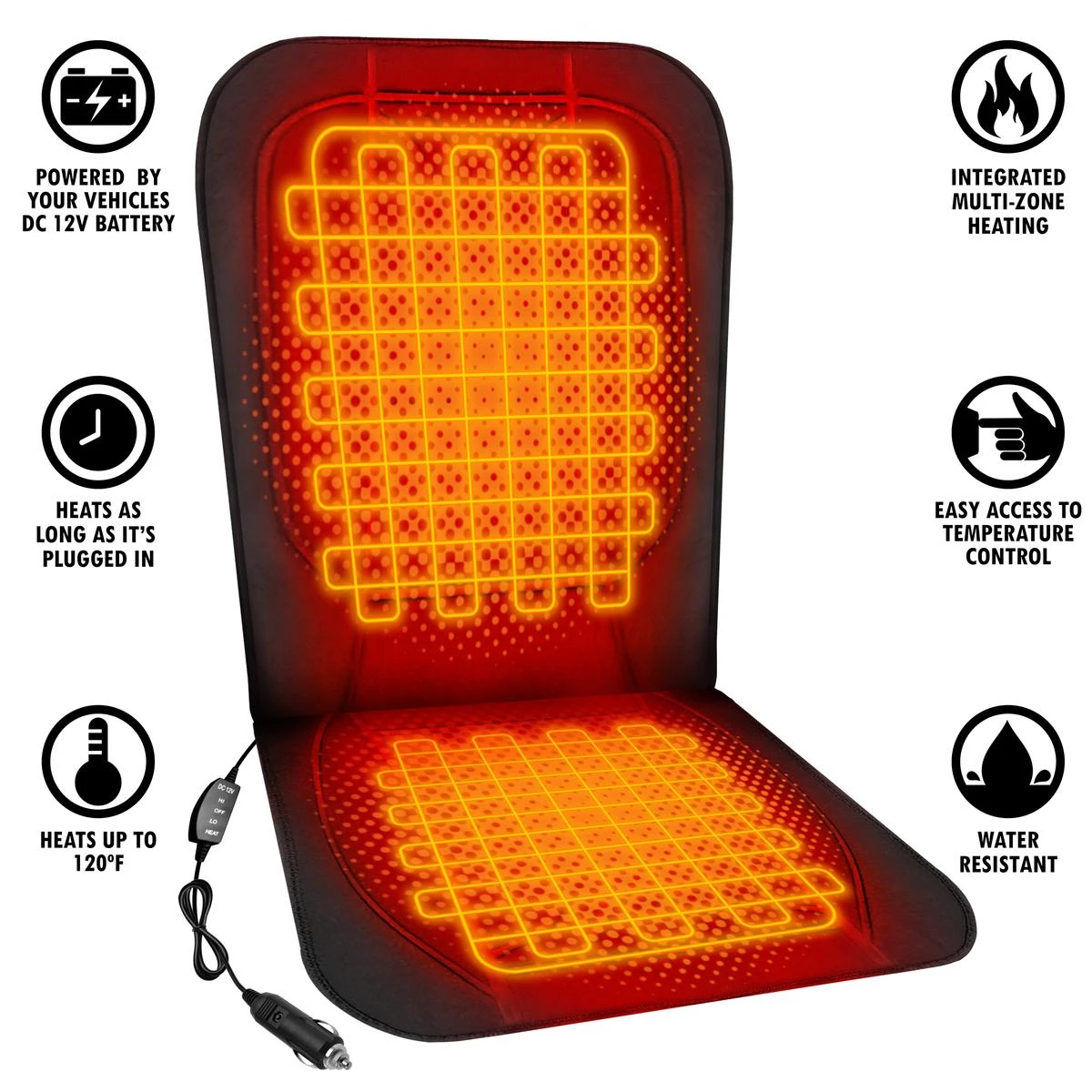 The ActionHeat 12V heated seat cushion is perfect for all cold weather and winter driving. Soothing heat helps to maintain your metabolism and steady blood circulation. Simply plug the 12-volt cigarette lighter adapter into your vehicle and the cushion warms up immediately. There are two convenience heating levels (low and high). Take the chill off your car seat with this soft pad that instantly provides warm, radiant heat.