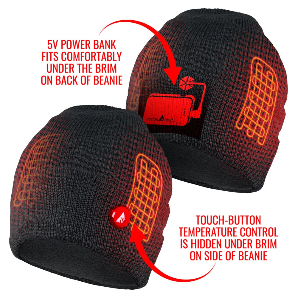 - Patented Technology: The ActionHeat 5V Battery Heated Knit Hat features advanced heating pads on the ears, which offers targeted heating to keep you warm. It is powered by a compact 5-volt rechargeable battery.