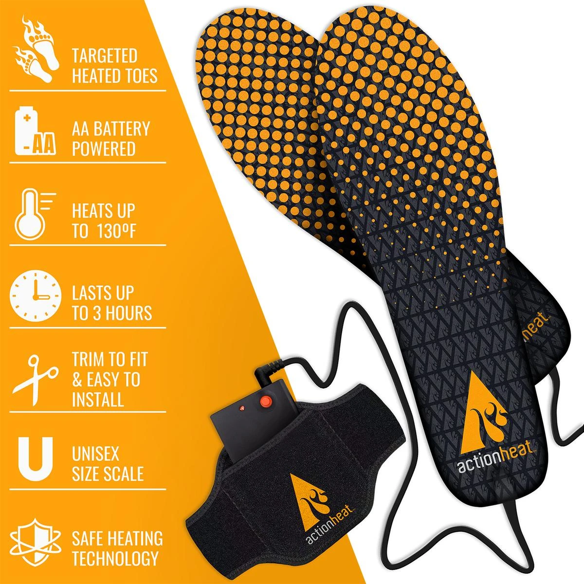 The ActionHeat AA heated insoles are ideal for any cold-weather activity. Powered by AA batteries, these insoles heat up to 140F and last more than 2 hours. With built-in, ultra-fine heating panels strategically placed under the toes, your feet never have to be cold again! Featuring an easy on/off button, it’s easy to add warmth and keep your toes nice and toasty.