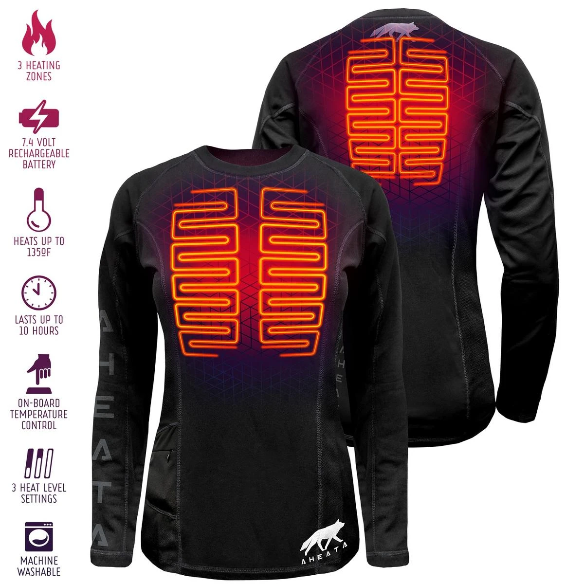 The Aheata Base Layer Shirt for Women brings soothing heat right to where you want it. Wearing a heated base layer keeps the heat close to your body so you warm up quicker and stay warm longer.  Slip on a Women’s Aheata 7 Volt Base Layer under your normal clothing to trap in the heat. Put on your winter jacket for even more heat insulation! The Aheata Women’s Battery Heated Top is perfect for chilly offices, a fall motorcycle trip around town, fishing, hunting, bicycle ride, or any everyday errand you have planned.