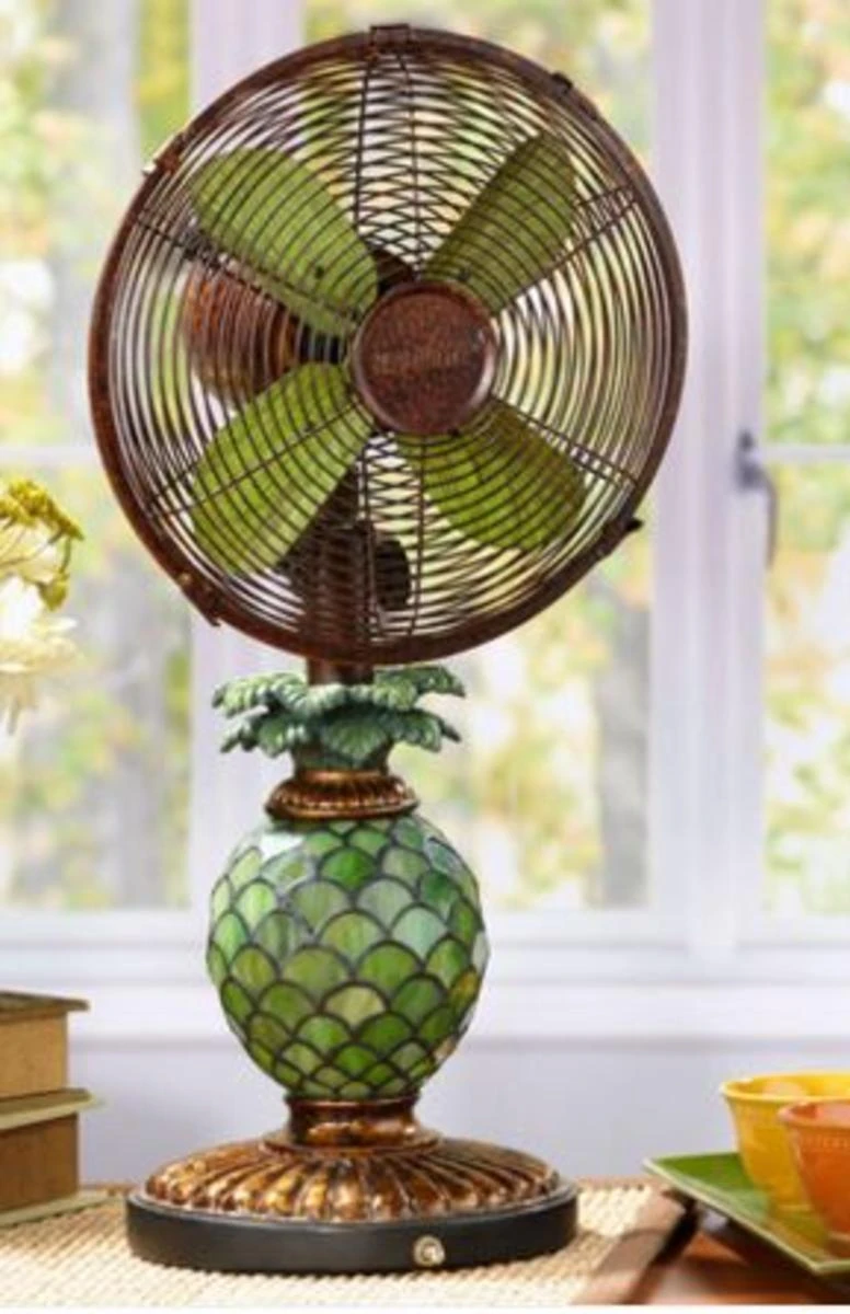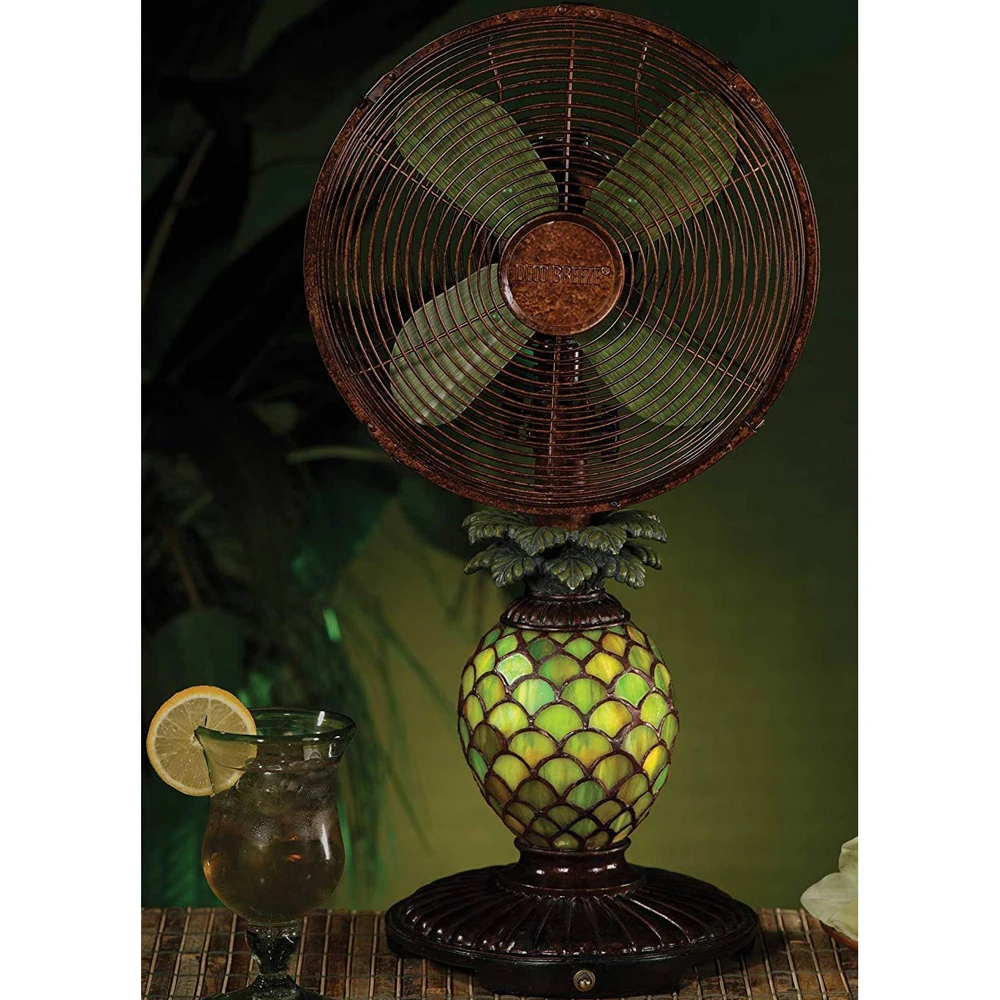 Mosaic Glass Pineapple illuminates when night light function is turned “on”. Tropical design features oscillating fan with whisper-quiet 20 watt motor. options for maximum cooling comfort. Single Speed Motor.