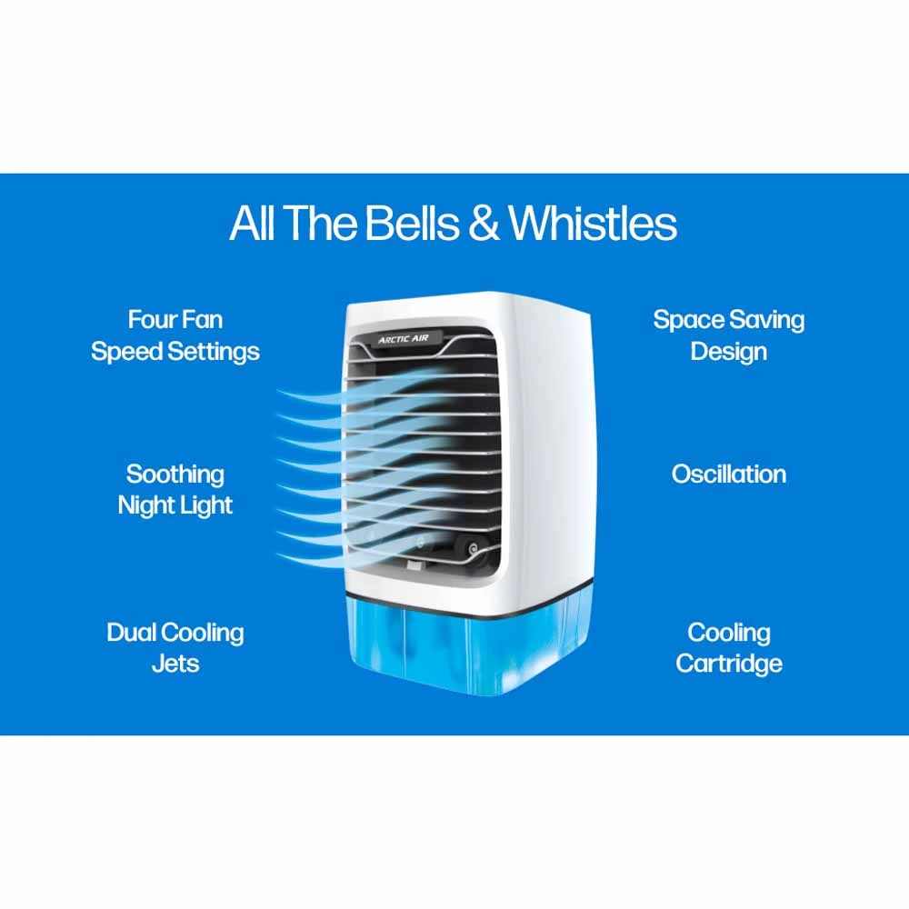 - Powerful Personal Portable Cooler – The Ontel Arctic Air Chill Zone XL evaporative air cooler features Hydro-Chill Technology with three cooling jets and an evaporative cooling cartridge that helps turn hot air into cool, moist, refreshing air, instantly!