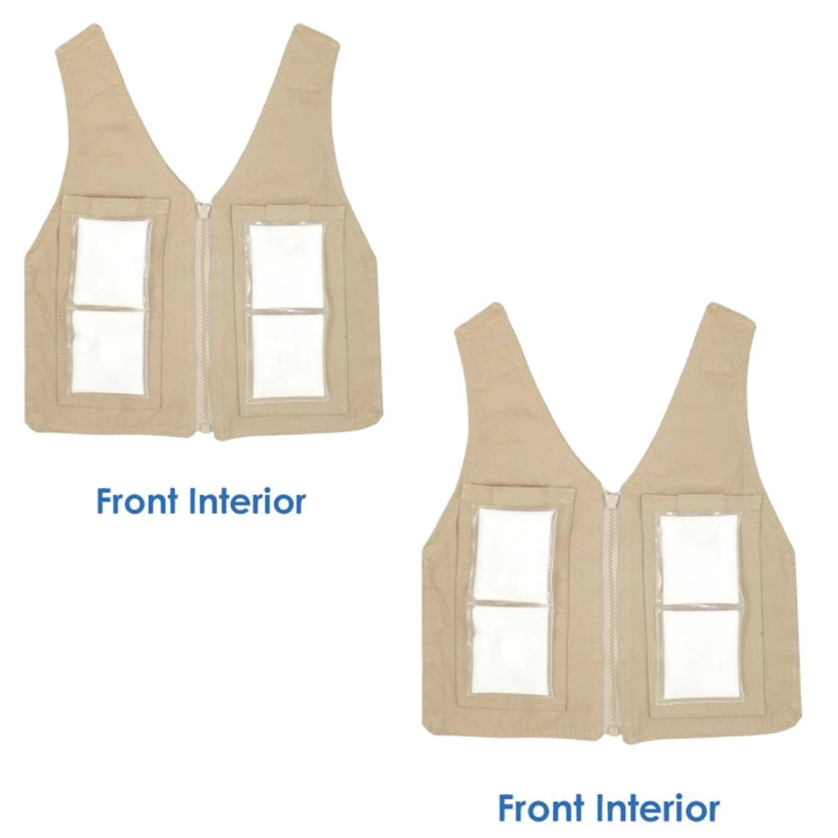 - Insulated Pack Pockets: Packs fit into insulated pockets inside the cooling vest. The pockets have a comfortable all-cotton fabric to protect the skin and an insulated outer composite fabric to direct the cooling energy toward the body. Temperature may also be adjusted for comfort by increasing or decreasing the number of clothing layers beneath the vest or the number of packs used.