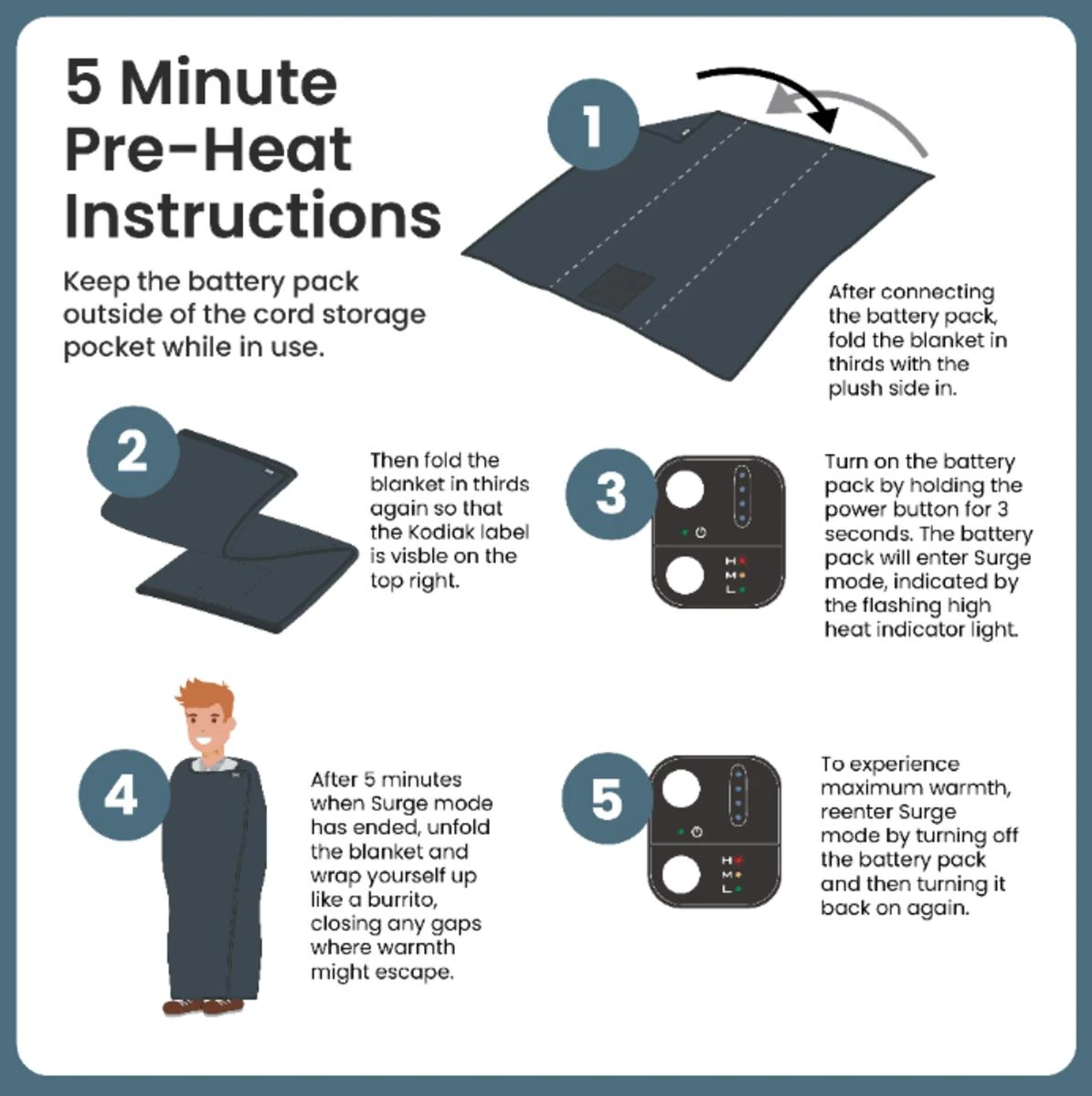 The first is the Kodiak Surge battery pack. Always use the Surge Battery Pack first. The Surge increases the voltage in the first 5 minutes of use. We HIGHLY recommend that you Surge the battery pack twice to get the blanket warmer faster!