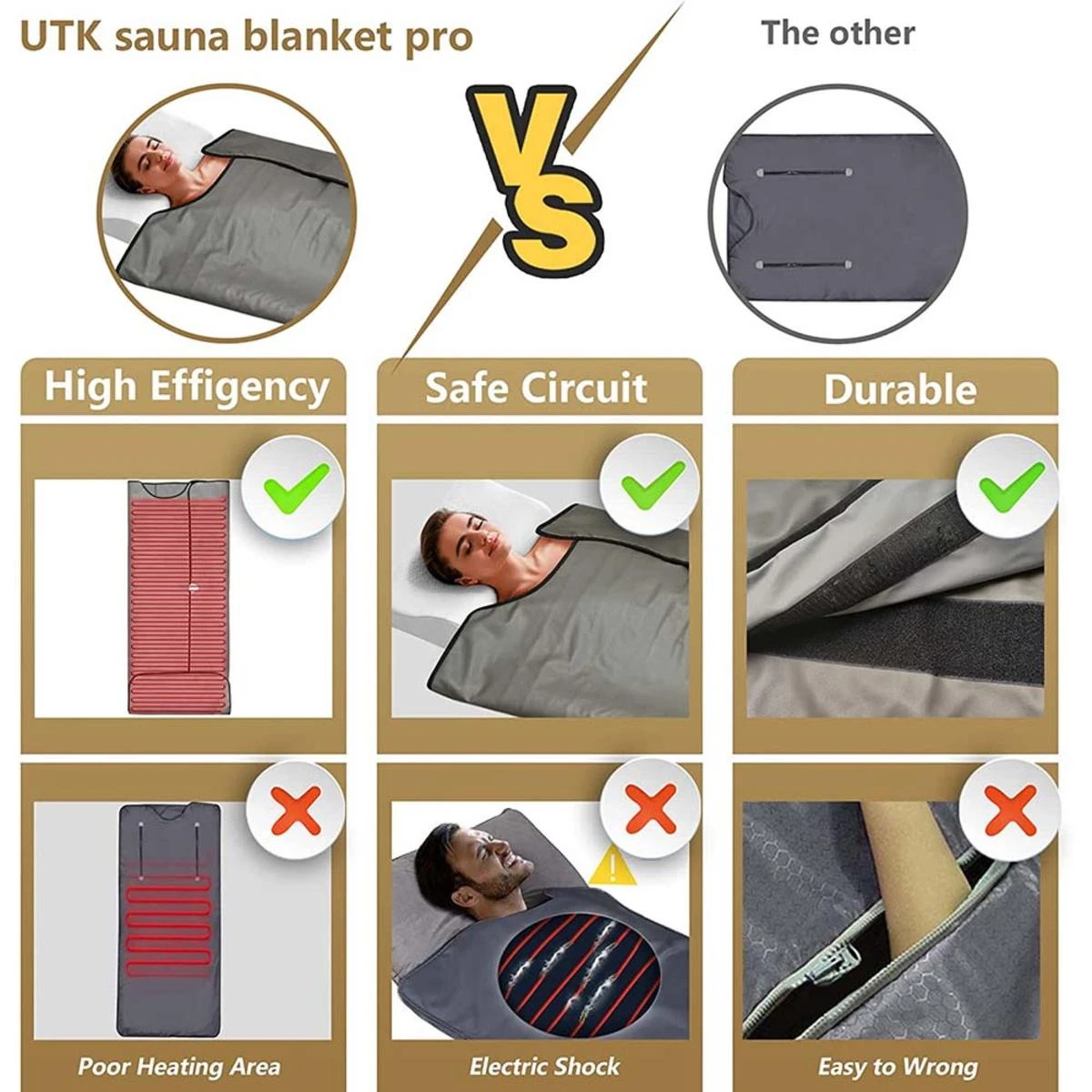 - Detox Deeply-Far Infrared Technology: UTK sauna blanket uses 660nm photons combined with far-infrared technology, which can penetrate human tissue to 4-6inches. Infrared heat detoxification is 7 times more effective than a steam sauna at a working temperature of 103F-159F