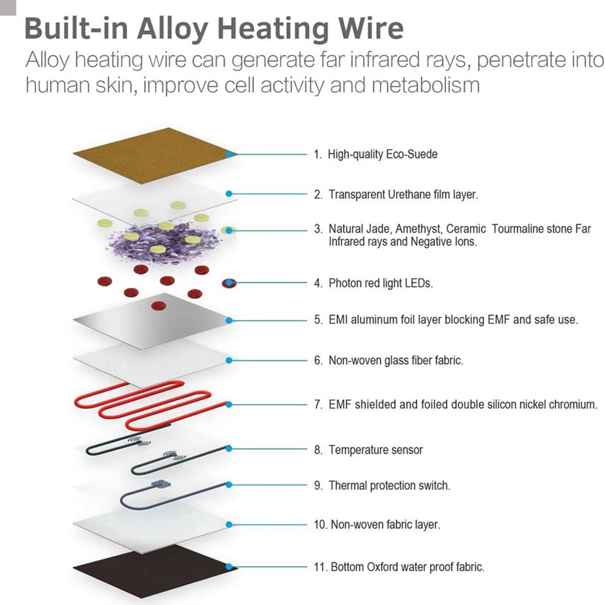- Pad Material: Eco-Suede, 12 natural Jades Stones, 12 tourmaline Stones, 12 photon red light