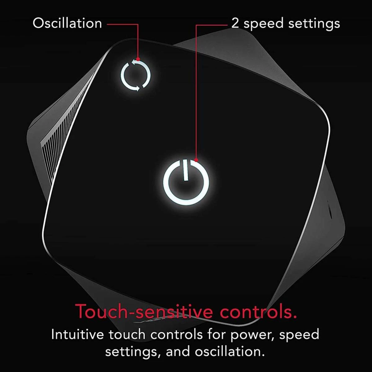 - Illuminated touch controls: 2 speed settings can easily be adjusted through the intuitive one touch button with separate back-lit button for oscillation on demand.